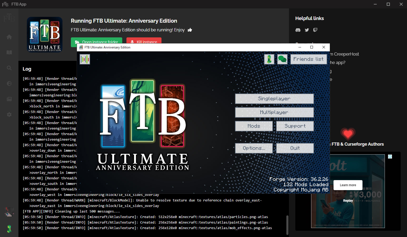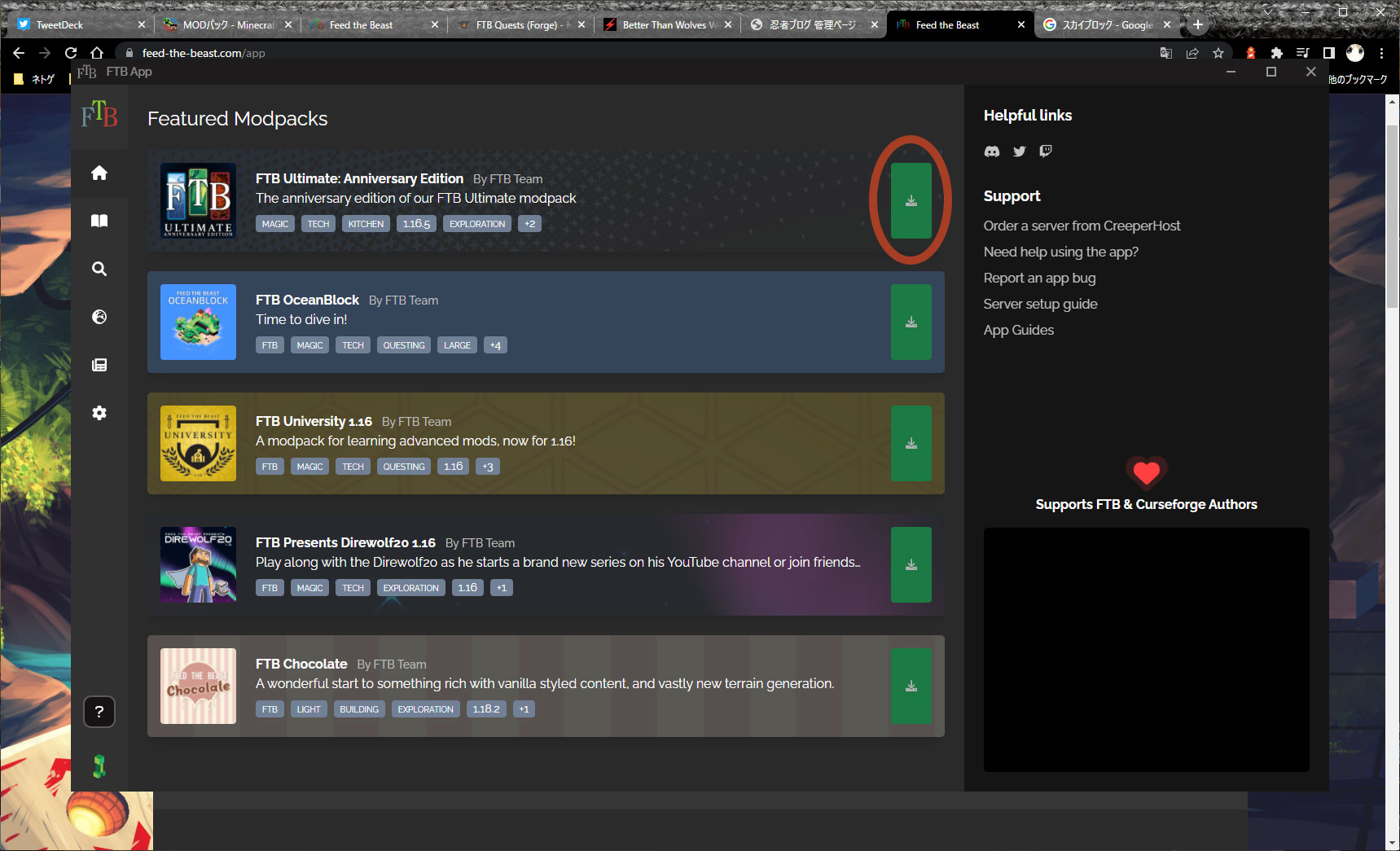 【Minecraft】2022年4月最新MODパックFTB導入の仕方について【Windows】 2022年05月01日 minecraft 0 http://5cm.3rin.net/minecraft/%E3%80%90minecraft%E3%80%912022%E5%B9%B44%E6%9C%88%E6%9C%80%E6%96%B0mod%E3%83%91%E3%83%83%E3%82%AF【Minecraft】2022年4月最新MODパックFTB導入の仕方について【Windows】 ・まず初めに、FTB(Feed the Beast)とは何か。元々はスカイブロック(*1)などのチャレンジ用のMAPやそれ用のMODを組み合わせた調整を行っていたグループでした。そして有名なライブストリーマーたちによって注目を集め始め、MAP公開をはじめ、MODを組み合わせて簡単に配布できるパックなど、インストールを合理化するランチャーを作成をして、より多くの人々がマップにアクセスできるようにするために、FTBランチャーが作成されました。多分こんな感じだと思う。間違ってたらコメント等で指摘してください(´・ω・)*1 空に浮かぶ島にオークの木とアイテムが入ったチェストのみの世界から始まる※この記事ではJava版を購入して行っております。統合版当でできるかはわかりません。・導入方法についてまずはFTB公式サイト・https://www.feed-the-beast.com/へアクセスします。アクセスしたらFTBAppを押して進みます。 『DownLoad for 〇〇〇〇〇』を押してAppをダウンロードします。 アプリを起動するとこんな表示が出ます。次へを押して進みましょう インストール先などを決めて次へ インストールに少しかかります。インストールが完了したら一度起動してみましょう。 起動し、ロードが終わるとこんな画面になります。各MODパックを選んでダウンロードしよう。 ここでは、『FTB Ultimate:Annibersary Edition』を例としてダウンロードしていきます。 ダウンロードボタンを押すとMODヴァージョン選択をしてインストールボタンを押しましょう。 大量のMODが入っているので時間がかかります。終わったらプレイボタンを押して先に進みましょう。初回の場合はMicrosoftアカウントへのログインが必要になります。※mojangアカウントはMicrosoftアカウントへの移行が始めっていますので、まずそちらを先にやりましょう。 ボタンを押したらブラウザに確認画面が出てきます。その後しっかりとログインして、アクセス許可させましょう アクセス許可が終わるとこのような画面が出るので、アプリ側に戻りクローズボタンを押します。そうするとプレイボタンが出ている画面に戻るので早速プレイしていきましょう!こちらでもMODの多さからロードが長いですが我慢です! あとはいつもと同じようにプレイができます! 一度ログアウトして再度プレイをする場合は、FTBAppからアクセスしましょう。通常のMinecraftランチャーからはMODパックを起動できませんのでご注意ください ※MOD導入に関しましては各自の自己責任でお願いいたします。 [0回]PR